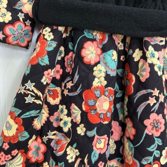 This vintage I Appel robe, likely from the 1970s. It features a black velvet bodice with three-quarter length sleeves and a floral print skirt and trim. The zipper goes about 3/4 and down the road. The robe has a matching belt. The style is reminiscent of the era with its combination of luxurious velvet and bold floral patterns, which is consistent with the I Appel brand known for robes and loungewear. This item is in excellent condition.
