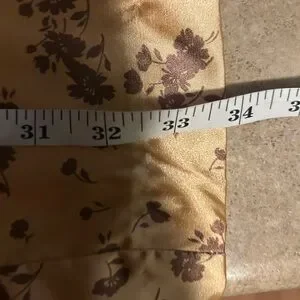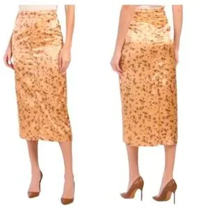 Fabulous shimmery coppery gold and brown floral satin midi skirt. Lightweight and flowy, with great movement! Zip back closure. Clean and in good condition!