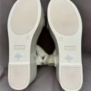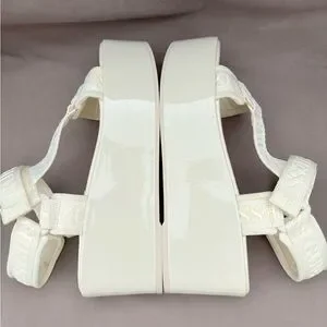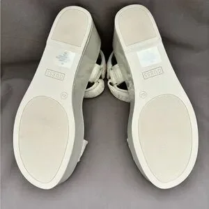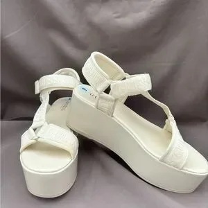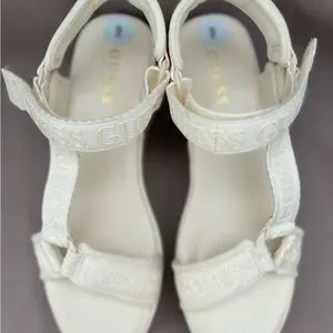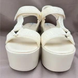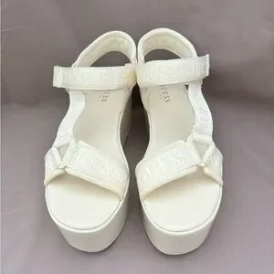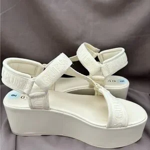 GUESS Los Angeles Platform sandals with front and side straps. A lot of glam, coastal, fairy, bohemian, whimsical, cottage core, ballet core, gypsy, stretchy, lightweight and comfort galore! The off white color is perfect for weddings, parties, dinner out, picnics, graduation, theater and concerts. A must for spring and summer wardrobe! Comfy.