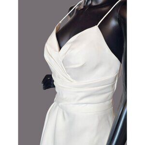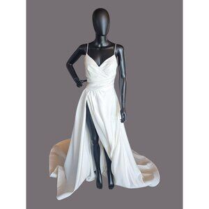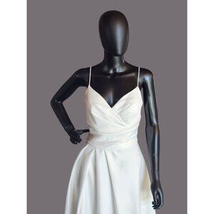 Float down the aisle in our Minimalist A-Line Ivory Satin Gown. Made from luxurious fabric, the spaghetti strap and sweetheart neckline accentuate your curves while the side ruching flatters the natural waist. The full pleated skirt with a side slit and horsehair trim creates an elegant movement as you walk, making you feel like a true work of art.