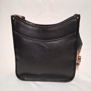 Stylish black leather crossbody bag featuring a unique patterned strap. Perfect for any occasion.