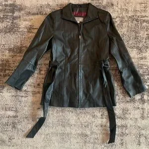 This black leather 3/4 length trench coat features a classic style with a front zipper closure and a neat collar. The slightly textured matte finish adds a touch of sophistication, while the adjustable belt ensures a perfect fit.