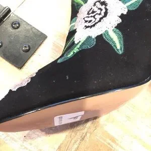 This Bryce bootie is covered in 70's floral embroidery. The narrow ankle silhouette sprouts a round toe and a retro block heel.