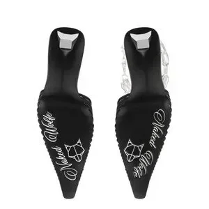 Step out in style with these chic black heeled mules. Featuring a unique chain detail, these shoes add a touch of elegance to any outfit.