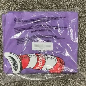 Supreme purple tee featuring cat in the hat graphic.