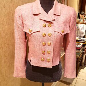 An amazing piece that would make Barbie proud! Vintage cropped, silk tweed blazer jacket in bubblegum pink with gold, enameled buttons. Very minor fading on side of sleeves, otherwise great condition for such a unique piece.