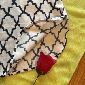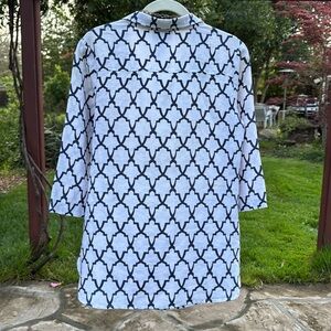 Poshmark Pals; You are Previewing a 100% Linen Black & White, Classy & Upscale Geometric Tunic Top by Neiman Marcus! In Misses Size Small (Please see Photo Tape Measurements for Additional Sizing Information). Collared with V-Neck. 3/4 Length Sleeves. Rounded Hem with Sexy Slits on both Sides. In Great, Pre-Owned Condition! Perfect for any occasion (with jeans, pants, skirts, or shorts) this Tunic Top offers a modern and sophisticated look. Thank you for 🛍️ here. Please Check out my Entire Closet and Bundle Items to Save 💰. I 🩷 my Poshmark Pals & Ship Fast for You! Debbie