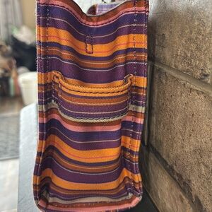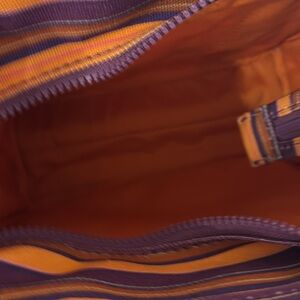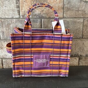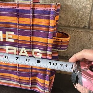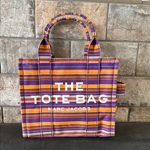 The Tote Bag. Iconic bag. Canvas. This is the smaller one and it is absolutely gorgeous. Elevate your style with the Marc Jacobs Striped Tote Bag. Featuring vibrant purple and orange stripes, this bag is perfect for any occasion. Make a bold statement with this chic accessory.