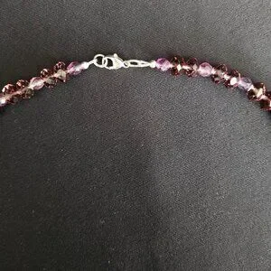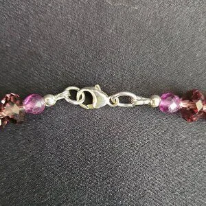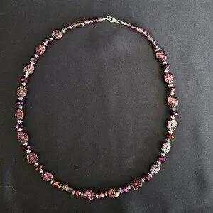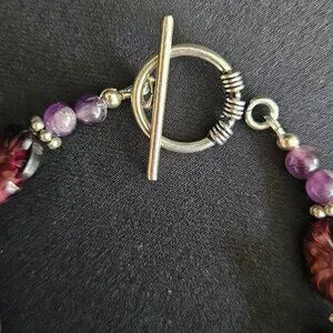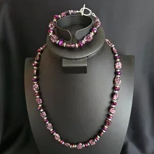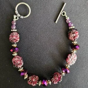 This purple 'Amethyst Delight' necklace and bracelet set is designed and hand crafted by me. The genuine Amethyst gemstones are lustrous, oval-shaped carvings representing lovely purple flowers. Amethyst colored, round faceted Fluorite gems and round, faceted fire polished Czech crystals, with ornate silver spacers, add a sparkling touch enhancing the beauty of this two-piece jewelry ensemble. All findings, including the necklace's lobster claw clasp, and the bracelet's ornate toggle closure are sterling silver.