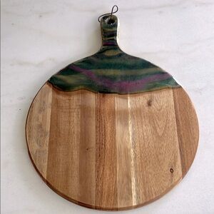 Enhance your dining experience with this elegant multicolor resin top wooden charcuterie/cheese serving board. Perfect for serving cheese, bread, and appetizers. Diameter is 11 1/2 inches.
