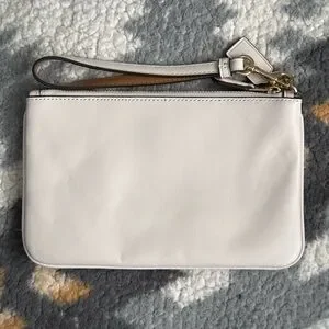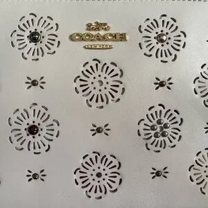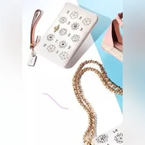 Elevate your accessory game with this stunning Coach wristlet, featuring a delicate cut-out Tea Rose design. Crafted from refined calf leather in a chic cream color with gold-tone hardware, this piece adds a touch of elegance to any outfit.