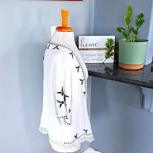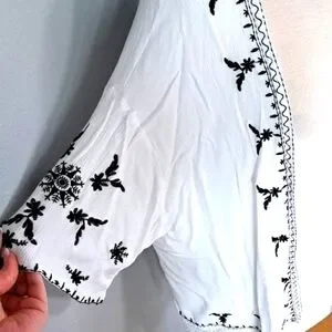 Summery white kimono cardigan featuring black embroidery and lace trim. Perfect for layering over a tank and shorts or a summer dress.