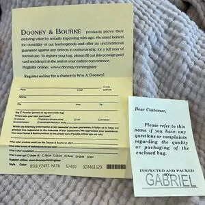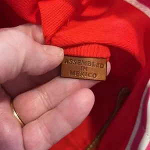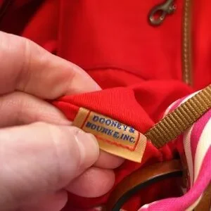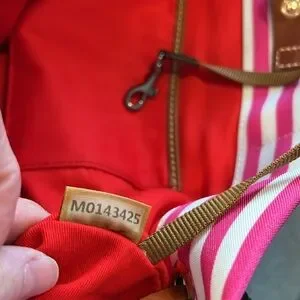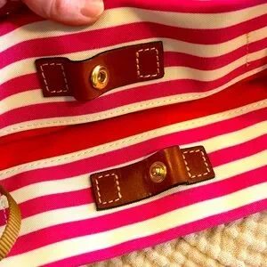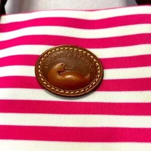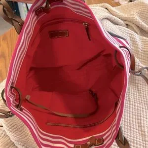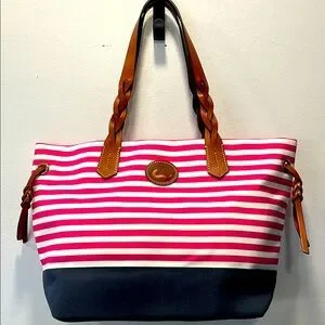 NEW DOONEY & BOURKE Shopper Tote Bag. Has Registration papers included. Bag is made from a heavy pink/white stripe cloth with a navy cloth bottom. Straps and side ties are brown Leather. Inside is an attached key clasp, a zip pocket & 2 slip in pockets. Snap close on Leather strips.