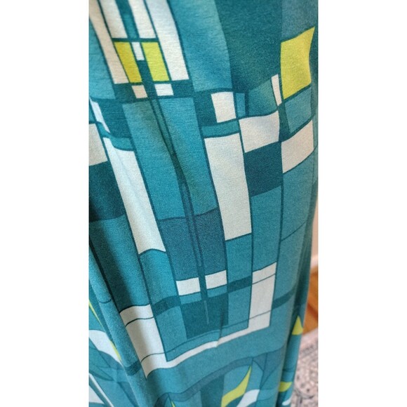 Beautiful shades of Blue/Green w/Yellow & White in a Geometric Print. Very soft, flowing material. Perfect for warm weather! Material at Bustline is gathered & held in place w/a Brushed Gold Ring w/Rhinestone accents. Very Pretty. Lightweight.