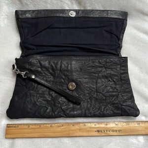 Deena & Ozzy Black Textured 100% Soft Goat Leather Foldover Clutch w/Wrist Strap