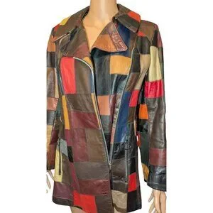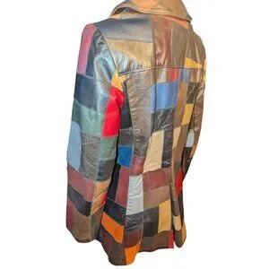 The La Vogue Patchwork Leather Jacket is a vintage women's piece in size 10, featuring a colorful geometric pattern in a 3/4 length. Made of leather with a mid-length design and long sleeves, this jacket is perfect for both parties and casual outings. It has a full zip closure, lined interior, zipped pockets, and a collared neckline, reflecting a hippie, colorful, and bohemian theme. This United States-made jacket is ideal for fall, adding a unique and stylish touch to any wardrobe. It is a classic piece from the 1970s!
