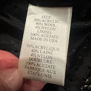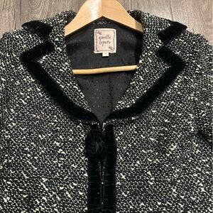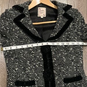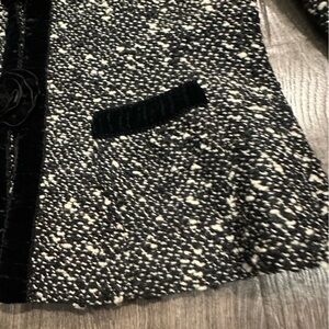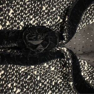• Features: Black and off white tweed wool blend suit jacket with velvet trim, pockets and velvet roses.