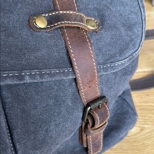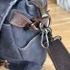 Excellent preowned condition, this bag show no signs of wear. This stylish messenger bag features a durable gray canvas body complemented by rich brown leather accents, offering a timeless and sophisticated look.