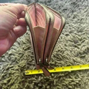 Good pre-used conditions. No major flaws noted, could use a cleaning as it’s been in my closet for a bit. Zipper expansion and lots of room for cards and room for much more. I could even put my phone in one side and zip it in.