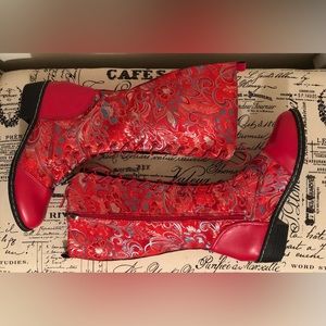 Boots; Fabric Upper; Floral Embroidery; Lace-Up, Side Zipper; Mid-Calf;Soft Sole
