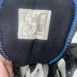 Stylish black and white high-top sneakers with blue accents. Perfect for casual wear.