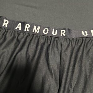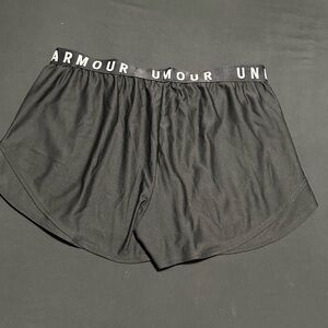 Under Armour Women's Play Up Shorts. Black in color with white lettering at waistband. Pockets on both sides. Great condition, only worn once.