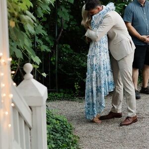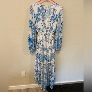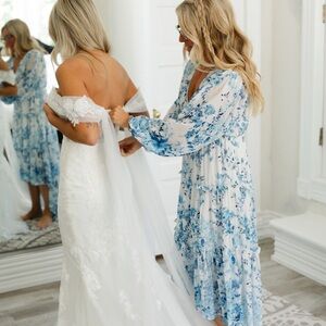 Beautiful hi low flowy dress, worn once as the mother of the bride dress. Lightweight, long sleeve, in EUC.