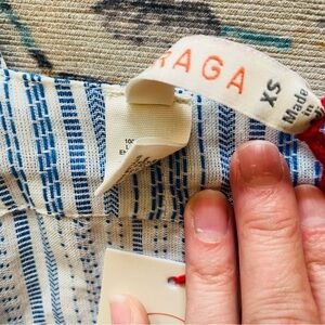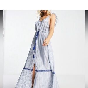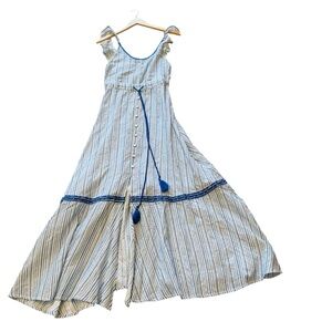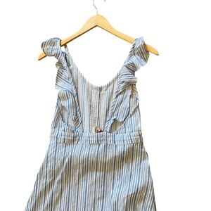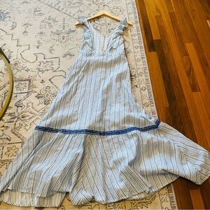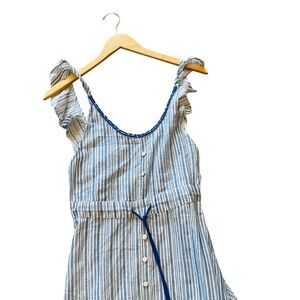 Blue and white stripe Mack dress with faux button front, ruffle straps and open back . Very flowy . NWT. Size XS measures shoulder to hem 55”, waist 12”