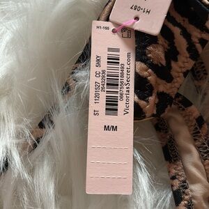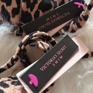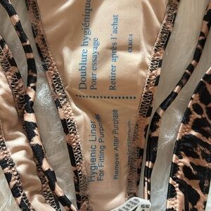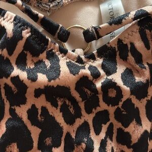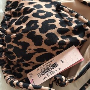leopard print bikini set with gold accents. Brazilian Thong Bottoms/Waist Wrap Ties/Padded Triangle Cups/TOP is size Small