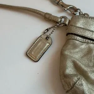 Early 2000s gold metallic wristlet clutch by Coach. Features silver tone horsebit hardware and zip top closure.