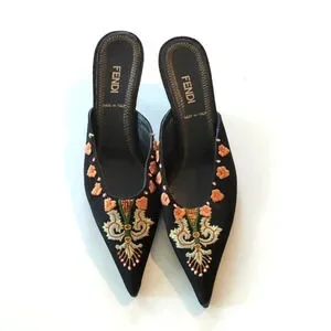 These Fendi heels feature a black color, a slide on fit, open back, a pointed toe, embroidery on top and a heel. Extremely rare and hard to find!