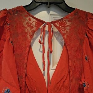 Free People Mockingbird Mini Dress Deep V Neck SS Open Back Hot Cherry Siz 8 NWT