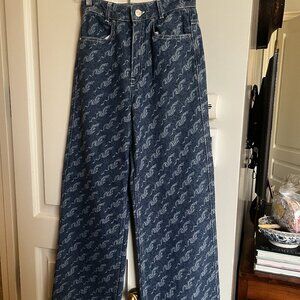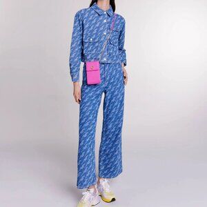 Denim set from Maje, featuring a patterned denim button up shirt (Size US S / FR 1)* and high waisted wide-leg patterned jeans (Size US XS / FR 34)**. Color looks bright blue in person (as advertised on the model). Both items are made entirely from organically farmed cotton. Only worn once and in excellent shape.