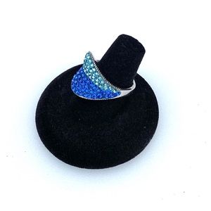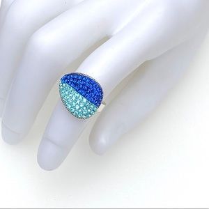 Gorgeous two tone aqua blue and royal blue pave set rhinestone ring in silver tone metal.