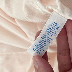 -FEATURES: very light pastel pink color accented by a lace bodice and lace trimmed elastic straps. It has a fitted top with long maxi-length flowing skirt. Very romantic, balletcore, cottagecore look with delicate details. Would be great to layer under vintage dresses or Gunne Sax! Made from a nylon spandex blend.
