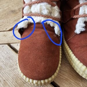 good pre-owned condition, boots are in need of stiching repair on the right boot as circled in pics.