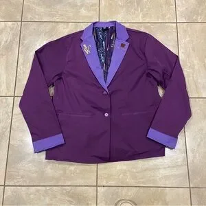 This structured blazer features a rich purple hue with elegant lavender accents on the cuffs and lapel. Its tailored fit offers a sophisticated silhouette, making it a standout piece in any wardrobe.