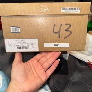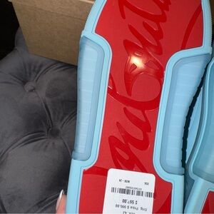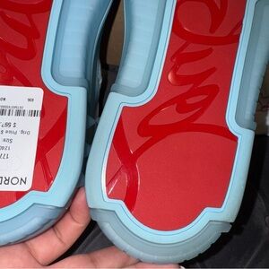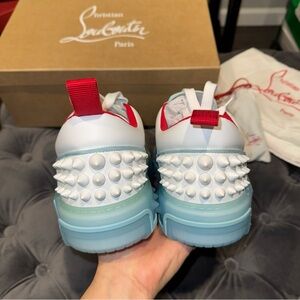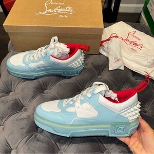 Men’s size 43. Christian Louboutin Astroloubi Spiked Leather and Mesh Sneakers. In white and blue. Originally $995.