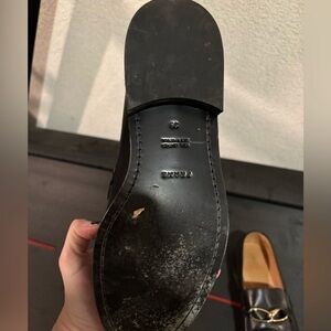 These black loafers feature a sleek slip-on design crafted from polished leather, highlighted by a gold-toned horsebit across the vamp. The low stacked heel and welted construction add durability and style, making them perfect for formal occasions.