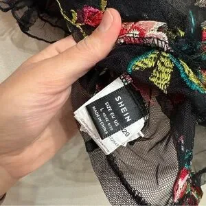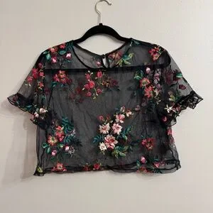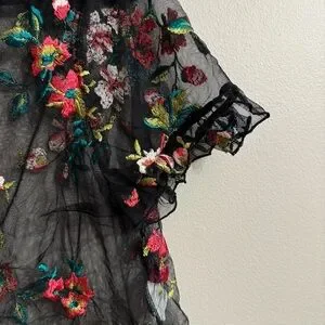 Floral Embroidered Sheer Black Top | Women’s Size Large