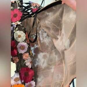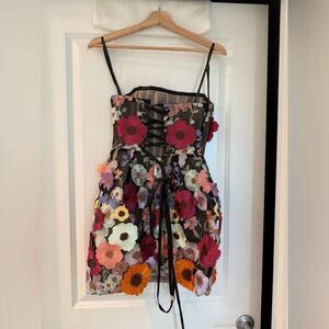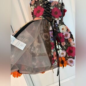 New without tags. In perfect condition. Dazzle in the Bouquet Maraya Multi Strapless Mini Dressa captivating blend of sophistication and whimsy. Floral appliqués Boned bodice Corset back Full lining