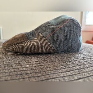 Elegant flat cap with a classic herringbone pattern from Boston scally. Features a mix of gray and brown tones. This particular hat is called the tradesman.