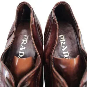 These Prada Wingtip Derby Oxfords blend timeless design with modern craftsmanship. Made in Italy, the distressed brown leather exudes sophistication and character. The wingtip detailing and lace-up closure enhance their elegance, while the leather sole provides durability and comfort. A statement piece for refined wardrobes.