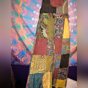 Vibrant patchwork overalls with a mix of patterns and colors. Features include a front pocket and adjustable straps.