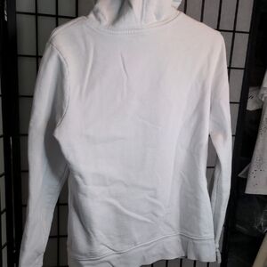 White hoodie featuring a vibrant logo in pink, green, and yellow. Comfortable and stylish.