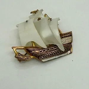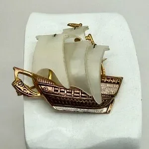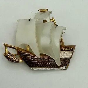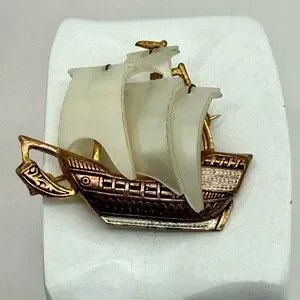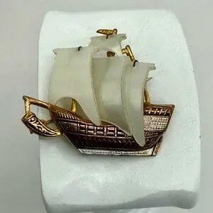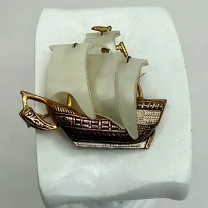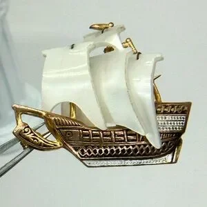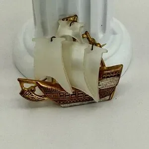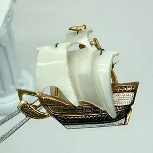 Vintage Damascene Sail Boat Ship w Mother of Pearl Faux Pearl Sails 1.5” Spain