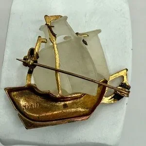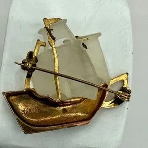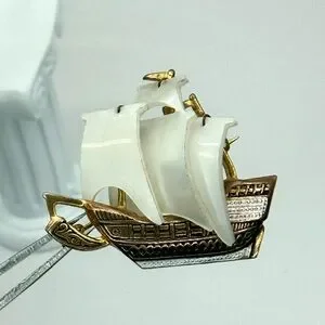 The brooch is marked “Spain” on the back, and features a secure pin clasp. A wonderful addition for collectors of nautical or Damascene jewelry, this piece is both charming and unique, capturing the artistry and romance of seafaring adventures.