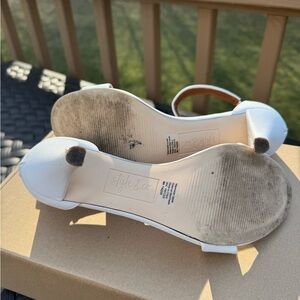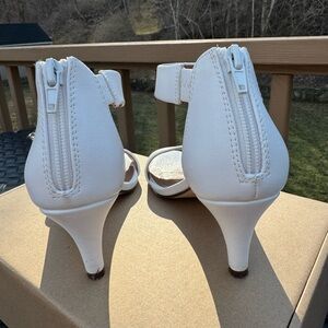 Step out in style with these elegant white heels. Perfect for any occasion, these shoes offer both comfort and sophistication. Worn gently 3 times, kitten heel, about 2 inches, zipper for easy on/off. Small mark on heel and strap, see photos.