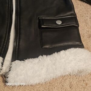 Stylish black faux leather jacket with cozy white fur trim. Perfect for a chic look.
