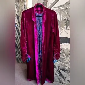This Regal violet, velvet long jacket adds a touch of sophistication that’s both elegant and casual. Spectacular inner lining with blue floral motif. Perfect worn as a light weight robe over a dress or gown for those cooler evenings.